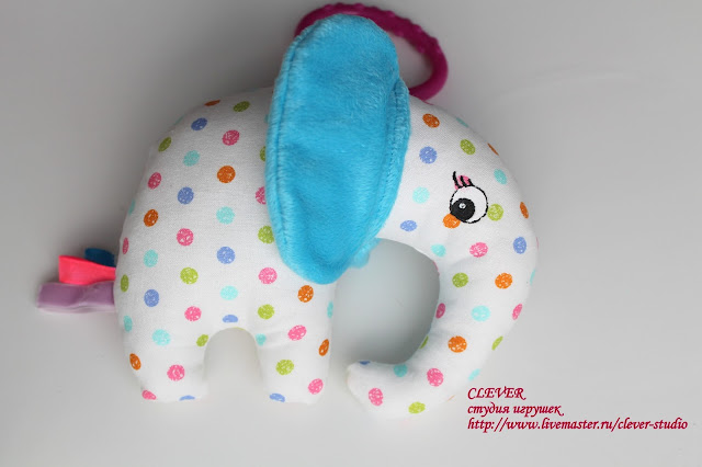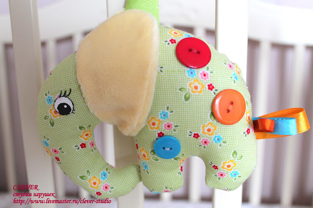 Один бок у слоника - с "сенсорной полянкой" из пуговиц, для тренировки моторики маленьких пальчиков. Уши Слонёнка - из плюша, шуршат, в животике - гремелка и гипоаллергенный наполнитель.